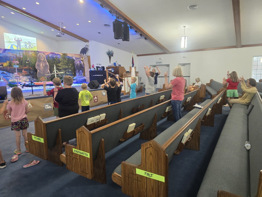 During morning worship, elementary-age children leave after music for their own age-appropriate lesson.